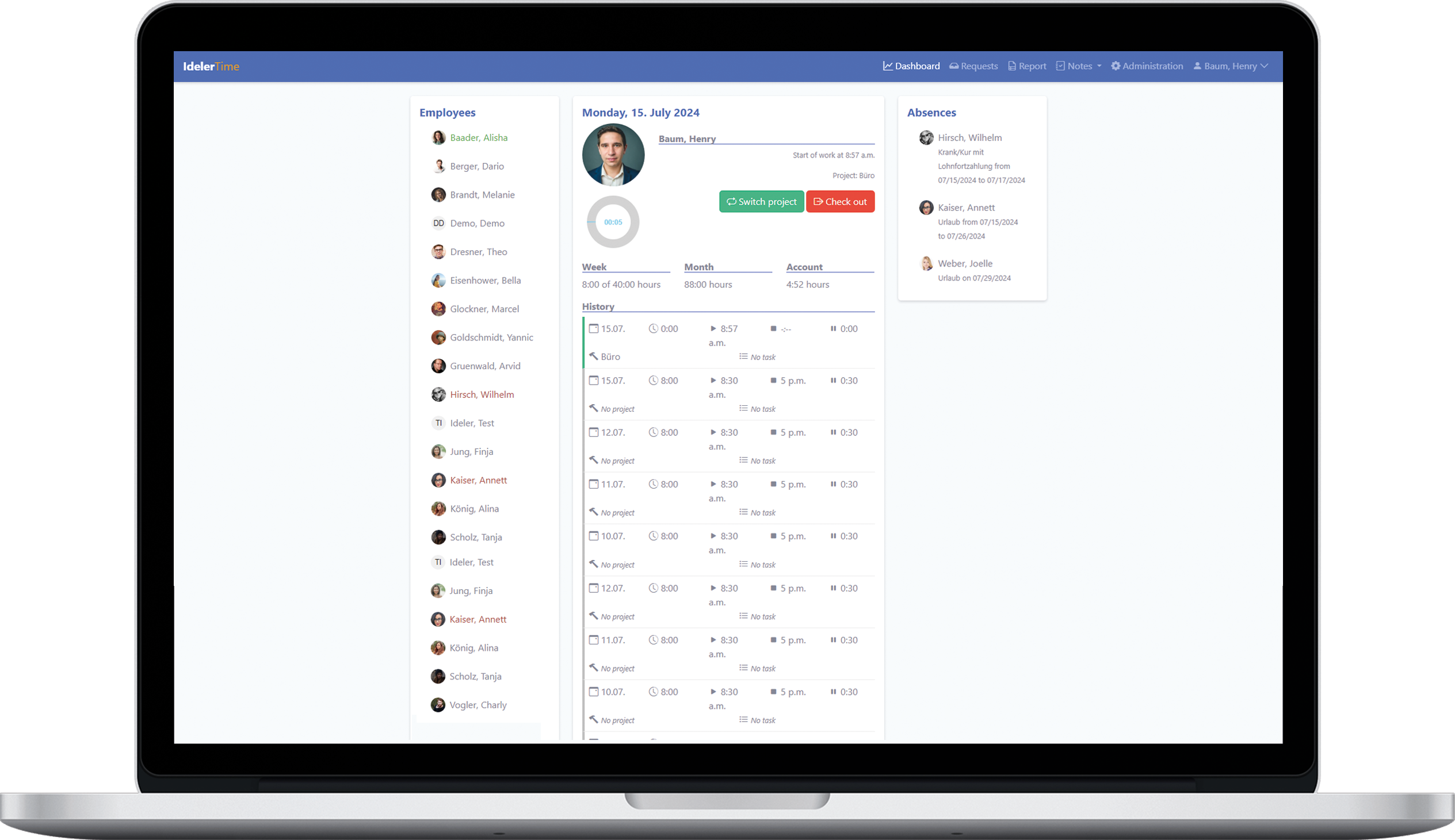 Depending on the user's authorization, IdelerTime web access can be used to check in and out of IdelerTime, view the history of time entries, add times or submit vacation and other requests using any web-enabled device.